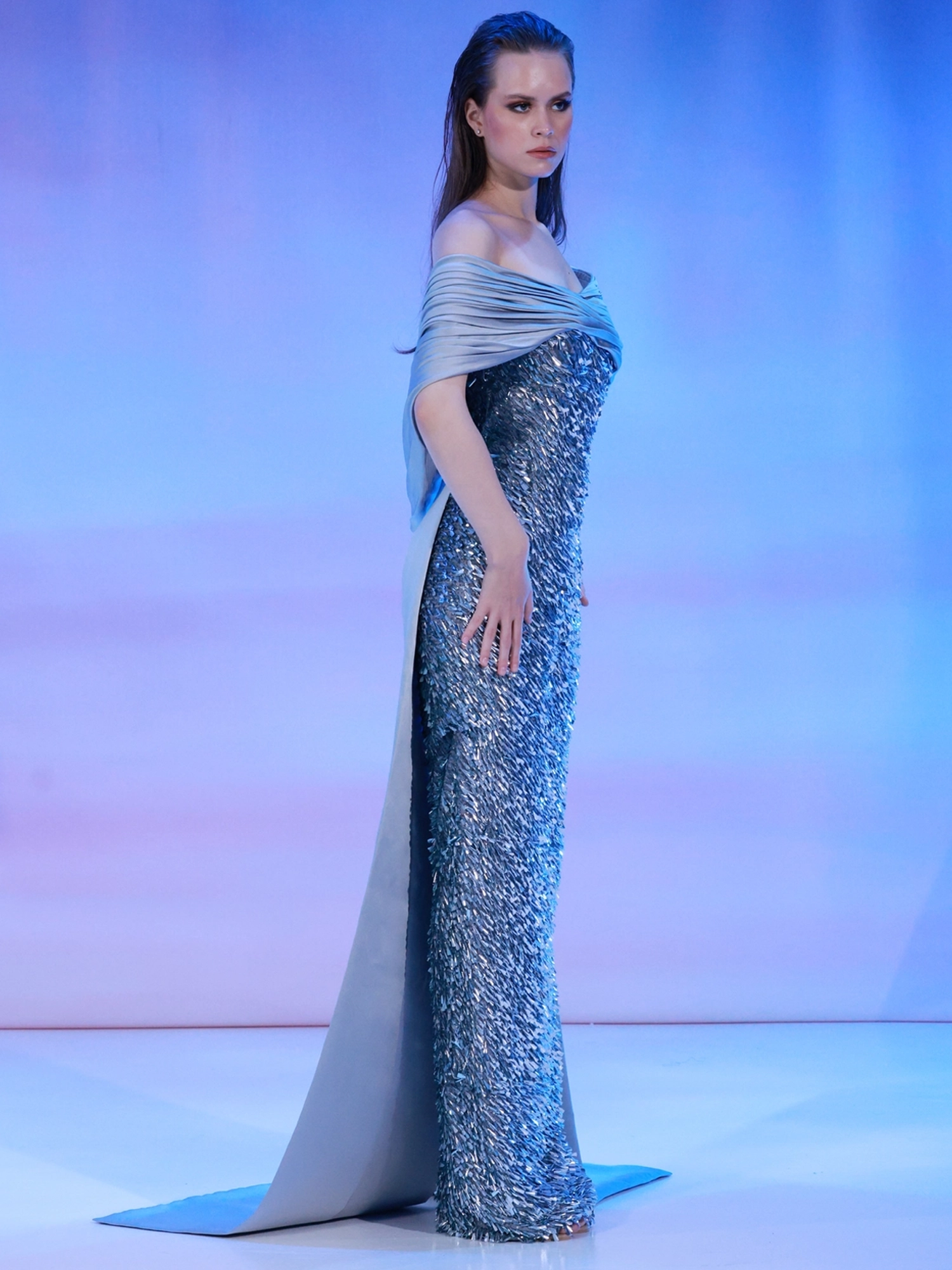 sequins. The skirt features a stylish slit for added flair.