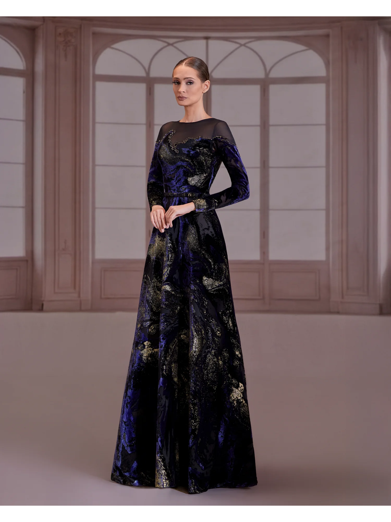 fw266-Navy and gold velvet dress with sheer illusion neckline
