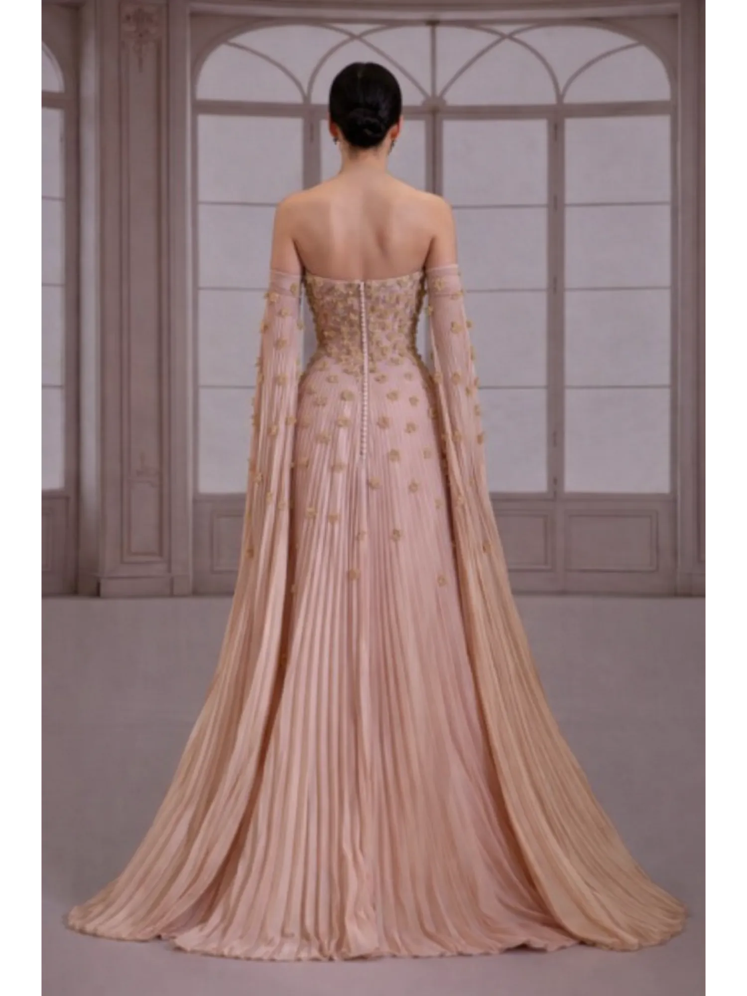 fw278- Champagne-beige column dress with a floor-sweeping cape sleeve
