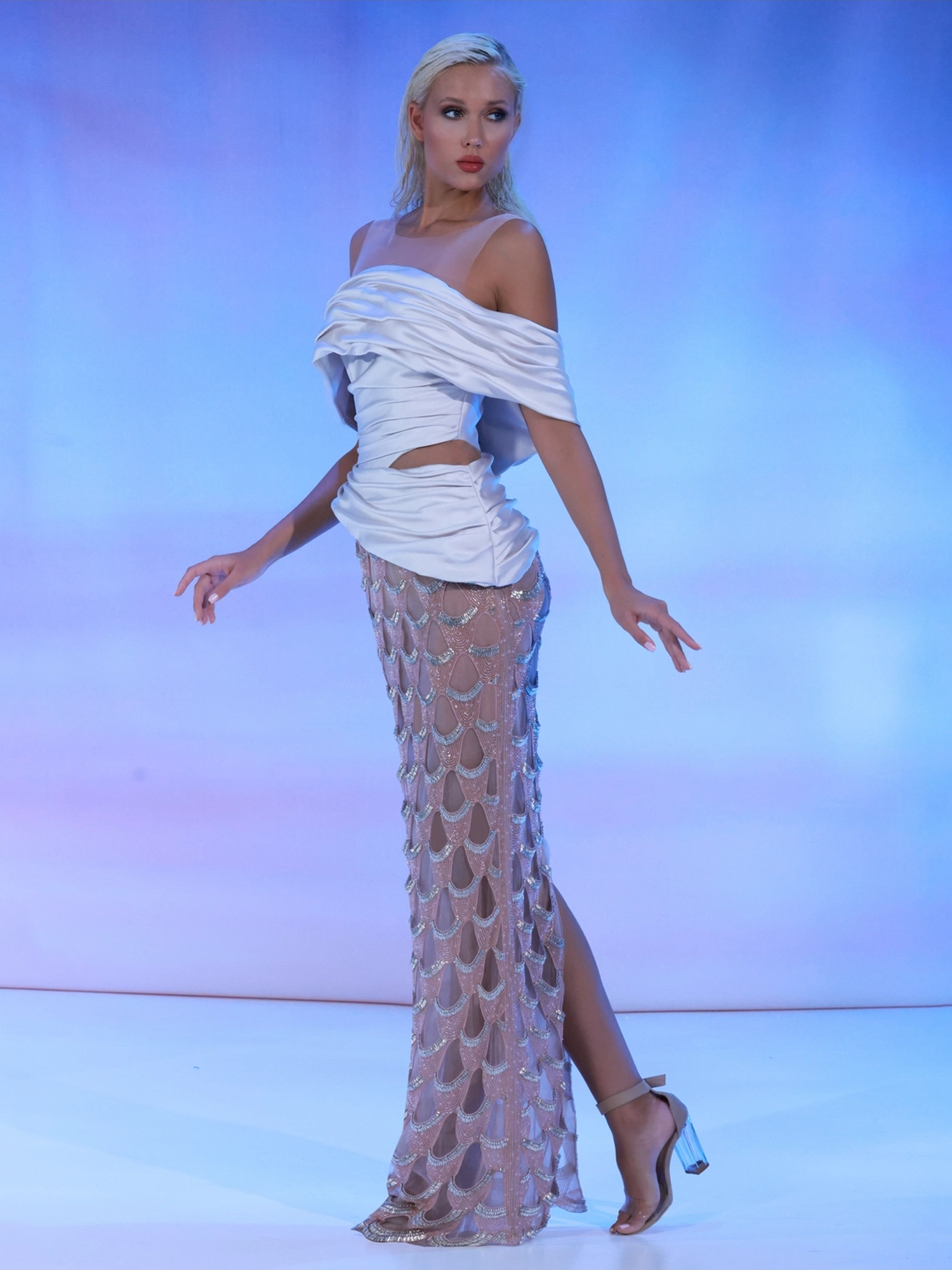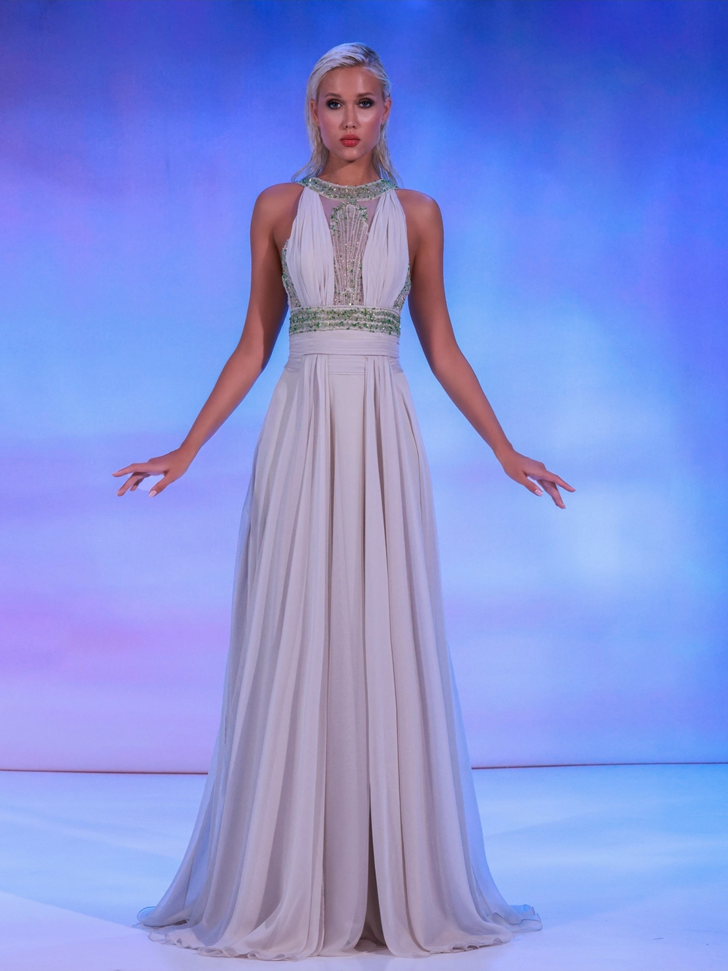 beaded top, complemented by elegant drapes that flow