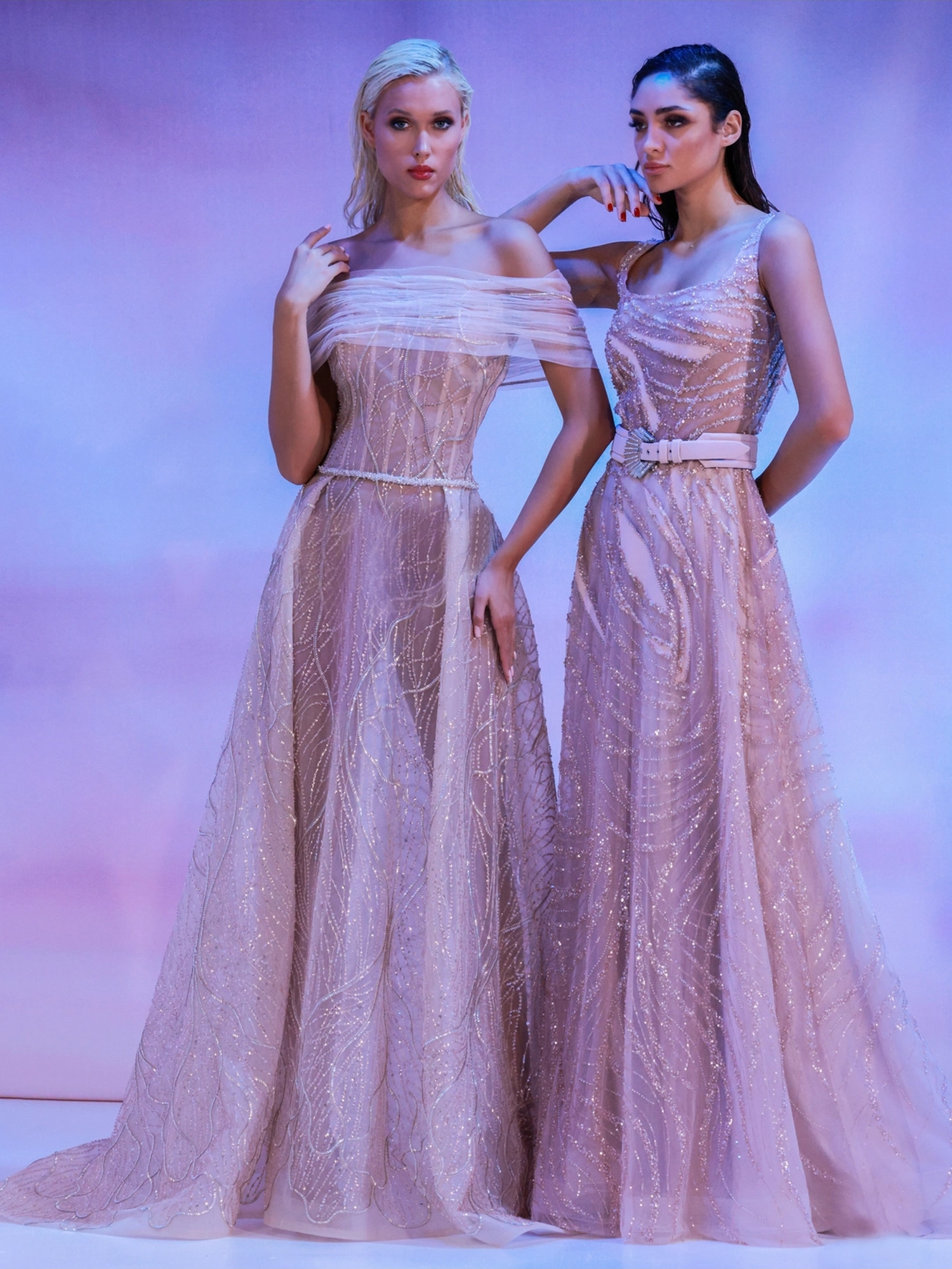 Off-shoulder pink dress fully beaded and features an