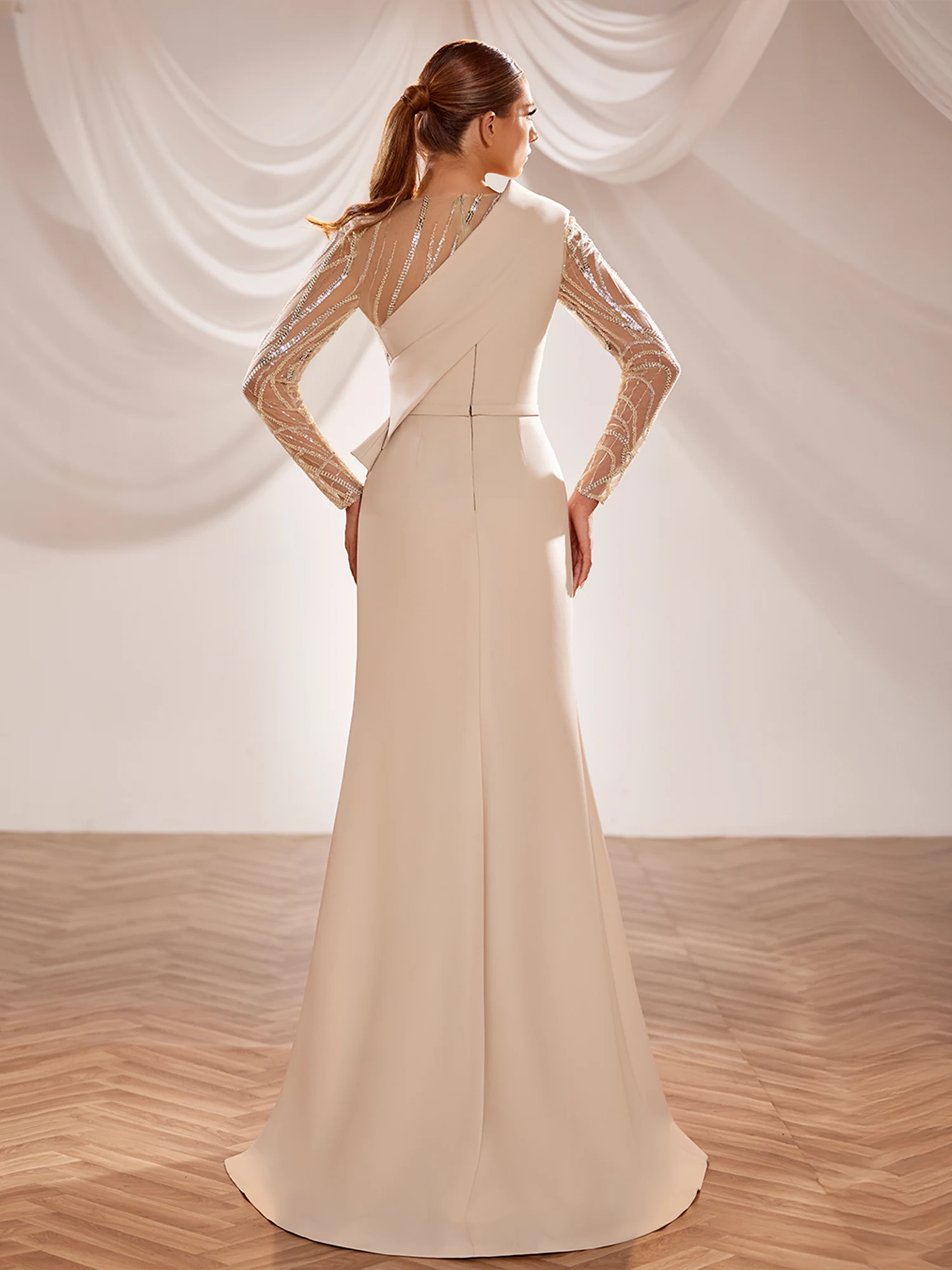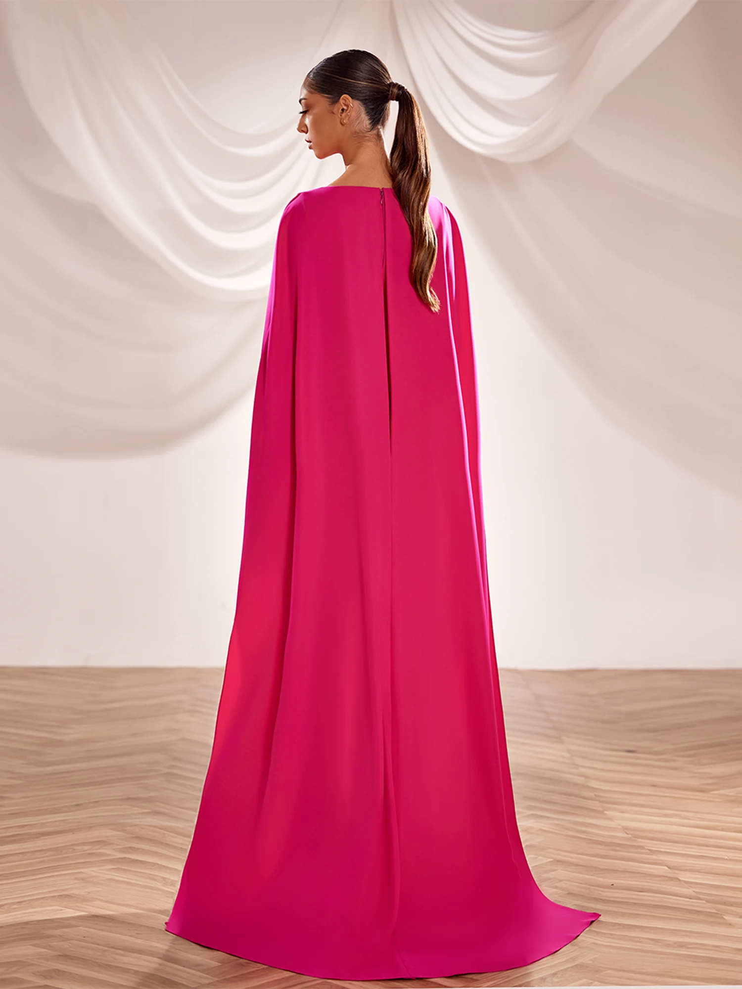Fitted fuchsia crepe gown with asymmetric neckline, structured shoulder strap, off-shoulder beaded sleeve, and sheer circular-floral embroidery blending into the crepe